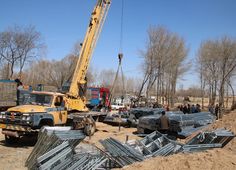 3月24日,在榆陽區(qū)孟家灣鄉(xiāng)板城灘村的大路邊,吊車轟鳴、人聲鼎沸,一派繁忙的景象。這里正在卸裝一大批蔬菜大棚的建設(shè)材料,工人們正在加緊卸裝,村民們紛紛前來圍觀,他們期盼的表情和歡快的言語中透露出對大棚增收的殷切期望。