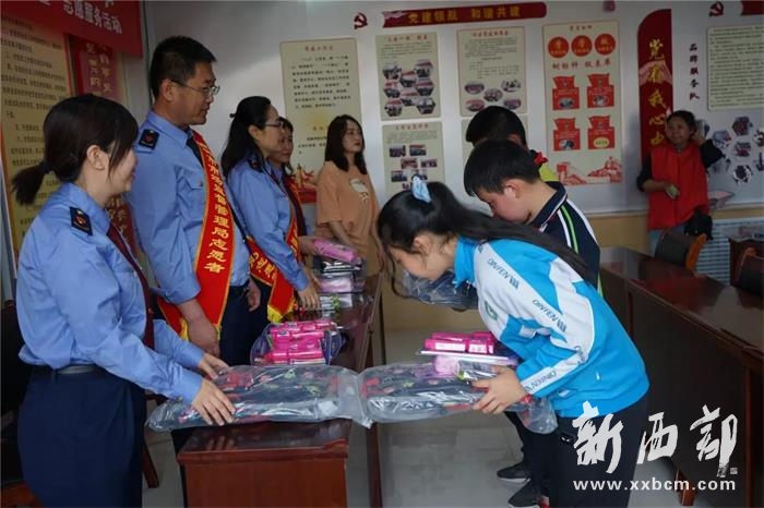 在航宇路社區(qū)幸福禾苗班也同樣進行著一場暖心的慰問活動?!半p報到”單位榆林市市場監(jiān)督管理局的黨員志愿者們給孩子們帶來了書包、文具盒、鉛筆及卷筆刀等學習用品,并和孩子們一起開展一次保護環(huán)境衛(wèi)生實踐活動,讓孩子們這個“六一”過的開心而有意義。在河濱公園活動現(xiàn)場,孩子們和志愿者一起沿河畔清掃垃圾和砂石;有的刮除電桿、墻面的“牛皮癬”廣告;有的在綠化帶內揀白色垃圾、煙頭,遇到難清理的垃圾,干脆放下工具,直接用手撕扯;有的對堆積物、雜草及各種垃圾廢棄物進行徹底清理。經(jīng)過小小志愿者的辛勤努力,河濱公園沿河畔的衛(wèi)生被打掃干干凈凈。
