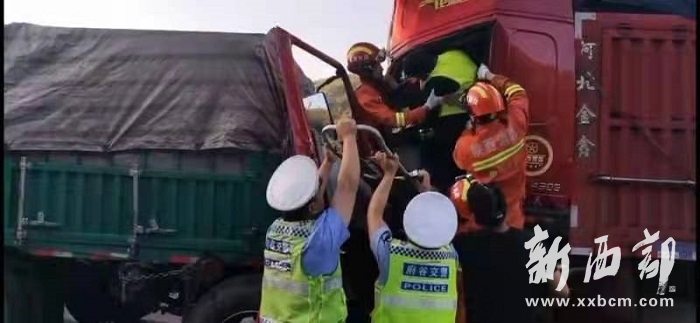 接警后,中隊民警迅速出警,同時聯(lián)系新民鎮(zhèn)醫(yī)院及消防部門趕往現(xiàn)場。事故現(xiàn)場,道路上三輛重型半掛牽引車相撞,其中一輛車頭變形嚴重且司機被困其中。消防部門立即對破損變形的車頭進行破拆,在大家的相互協(xié)作下,成功將被困受傷司機救出,及時送往醫(yī)院治療。后經(jīng)醫(yī)院診斷得知,受傷司機身體三處肋骨骨折及部分皮外軟組織損傷,由于救援及時,暫無生命危險。(喬少強 岳帥)