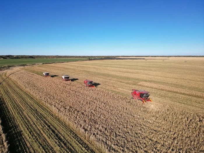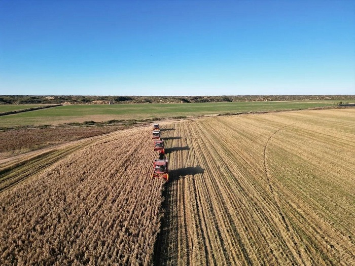 新西部網(wǎng)訊(通訊員 賈赟 張清羿)又是一年豐收季,遍地金黃谷飄香。近日,我區(qū)小紀汗鎮(zhèn)可可蓋村的2200畝谷子進入成熟收獲期。在谷子種植基地里,飽滿的谷穗壓彎了谷桿,在陽光的照射下,沉甸甸的谷穗閃著金光,微風(fēng)吹拂,谷穗輕輕搖擺,翻滾著,演奏著豐收的“樂章”。四臺大型聯(lián)合收割機穿梭其中,收割機自動進行割臺升降、行走收割、轉(zhuǎn)彎掉頭、倉滿卸糧,將地里的谷子全部收割、顆粒歸倉。