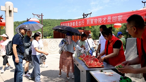 所有的旅游都是出行,到黃帝陵才是回家。黃帝陵保護(hù)管理服務(wù)中心團(tuán)委書(shū)記惠瓊說(shuō):“在炎炎夏日,我們送的是我們黃陵當(dāng)?shù)禺a(chǎn)的綠色無(wú)公害西瓜,讓游客真切地感受到只有到黃帝陵才是真的回家了,讓他們感受到家的舒心,家的味道?!?/p>