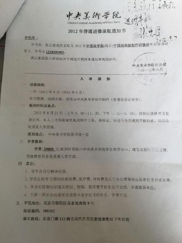 其中,一紙中央美術(shù)學(xué)院錄取通知書(shū)顯示,李?lèi)偲荚?012年6月被錄取為“2012年中國(guó)畫(huà)學(xué)院中國(guó)畫(huà)高級(jí)創(chuàng)作研修班”專(zhuān)業(yè)普通進(jìn)修生,進(jìn)修期一年(2012年9月—2013年6月)。
