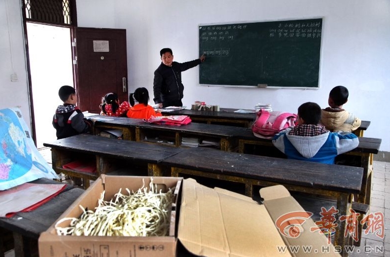 在學(xué)校的教室里,華商報(bào)記者看到,桌椅很陳舊,已經(jīng)用了十幾年,最后面還擺放著給夏天用的風(fēng)扇,邊上還有足球等,引人注意的還有一個(gè)裝有手工面的紙箱子。那是趙新正給孩子們買的,他要給孩子們做飯。