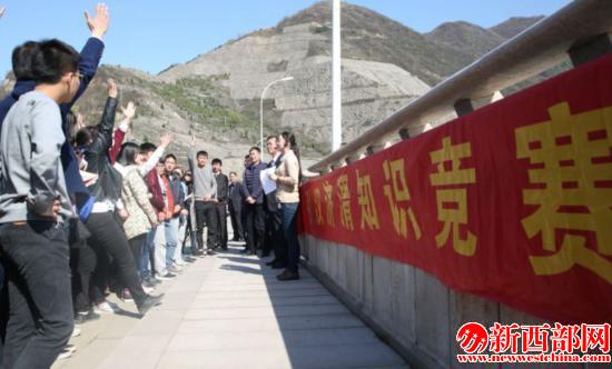 在黑河金盆水庫(kù)壩頂,大學(xué)生們?cè)敿?xì)了解了水庫(kù)概況和功能效益,并興致勃勃地參加了引漢濟(jì)渭知識(shí)競(jìng)賽?!澳阒酪凉h濟(jì)渭工程是調(diào)哪的水到哪里去?引漢濟(jì)渭工程將惠及多少城市多少人?”、“你知道引漢濟(jì)渭秦嶺輸水隧洞有多長(zhǎng)?”……這一道道由剛才參觀中所學(xué)、所知內(nèi)容變成的問(wèn)題,引得學(xué)生們競(jìng)相舉手搶答。主持人“回答正確”的鼓勵(lì)聲、學(xué)生們領(lǐng)到獎(jiǎng)品的喜悅情,讓周末的黑河金盆水庫(kù)壩頂掌聲此起彼伏,笑語(yǔ)不絕于耳。