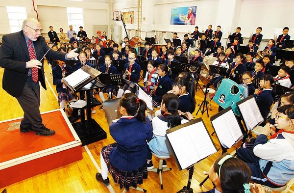3月21日,在西安市經(jīng)發(fā)學校,奧地利維也納宮廷樂團團長、維也納音樂大學現(xiàn)代音樂教授維爾納·哈克爾與該校管樂團的小團員們一起合練。今年7月,西安經(jīng)發(fā)學校管樂團將受邀赴奧地利維也納參加2016國際器樂藝術(shù)節(jié)暨世界樂團比賽,并參加在市政廣場、金色大廳等地舉行的演出。