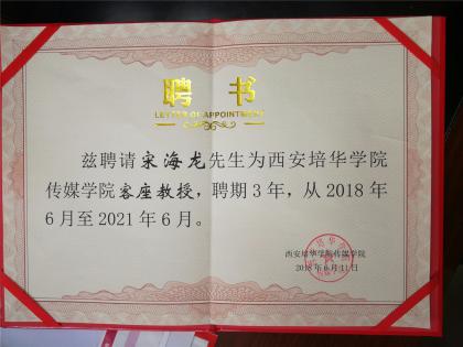 表彰大會(huì)上,西安培華學(xué)院傳媒學(xué)院院長(zhǎng)杜耀峰為西安商網(wǎng)總編輯宋海龍頒發(fā)了西安培華學(xué)院傳媒學(xué)院客座教授聘任證書。
