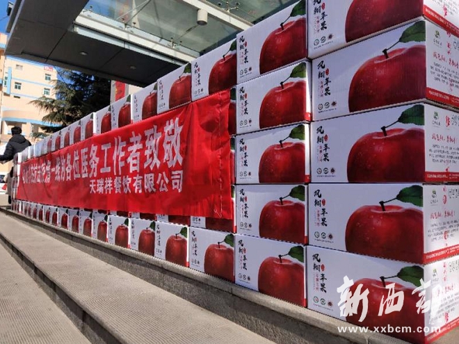 “蘋果寓意著‘平安’,而且還能增加維生素,希望大家平平安安、健健康康?!?月17日,寶雞天瑞祥餐飲有限公司總經(jīng)理何登科把300箱蘋果送到鳳翔縣醫(yī)院時對醫(yī)護人員這樣說道。該公司當天共向鳳翔縣醫(yī)院、鳳翔縣中醫(yī)醫(yī)院和岐山縣醫(yī)院捐贈蘋果900箱。