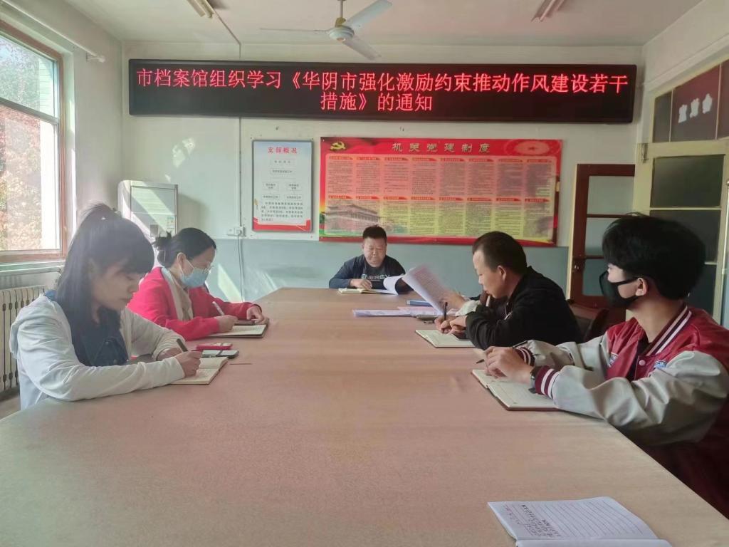 為深入貫徹落實(shí)“勤快嚴(yán)實(shí)精細(xì)廉”工作要求,切實(shí)轉(zhuǎn)變工作作風(fēng),9月26日,華陰市檔案館召開(kāi)作風(fēng)建設(shè)專題會(huì)議。會(huì)上,傳達(dá)學(xué)習(xí)了中共華陰市委組織部關(guān)于印發(fā)《華陰市強(qiáng)化激勵(lì)約束推動(dòng)作風(fēng)建設(shè)若干措施》《華陰市作風(fēng)建設(shè)專項(xiàng)考核辦法》等文件。并對(duì)近期重點(diǎn)工作進(jìn)行安排部署。