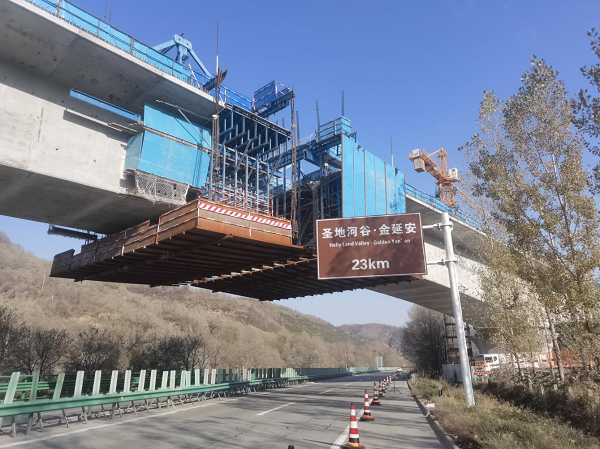 據(jù)了解,楊家灣特大橋位于陜西省延安市寶塔區(qū)柳林鎮(zhèn),全長641.02米,為立交而設(shè)。連續(xù)梁主跨跨延西高速公路K34+550處,采用(60+100+60)米連續(xù)梁結(jié)構(gòu),梁體為單箱單室、變高度、變截面箱梁,采用掛籃懸臂現(xiàn)澆法施工。