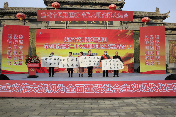活動中,為了深入學(xué)習(xí)宣傳貫徹黨的二十大精神,推動黨的二十大精神家喻戶曉、入腦入心,鳳翔區(qū)豐富創(chuàng)新載體,創(chuàng)新形式,創(chuàng)新方法,創(chuàng)新內(nèi)容,用理論宣講和文藝演出相結(jié)合的形式,把黨的二十大精神融入到群眾文化活動之中,糜桿橋鎮(zhèn)西白村帶來明快、樸實流暢的《西府曲子傳新聲》,范家寨鎮(zhèn)新時代文明實踐志愿服務(wù)隊表演快板《贊鳳翔》等,通過說“生、鮮、活”的鄉(xiāng)間俚語,講“短、小、微”的身邊故事,用形象鮮活生動的表現(xiàn)形式,增強了感染力和吸引力?;顒蝇F(xiàn)場還進行了交流互動,群眾踴躍提問,宣講團成員一一細致解答,同時宣講團成員現(xiàn)場贈給志愿者代表、“身邊好人”代表書畫作品,將活動掀向了高潮。