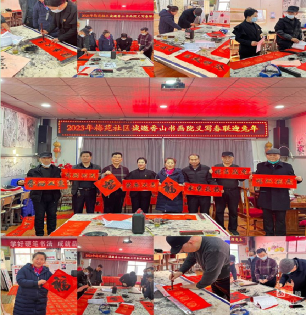 新年的鐘聲即將敲響。時光的車輪又留下了一道深深的印痕,伴隨著冬日里溫暖的陽光,2023年新年的倩影仿佛就在不遠處翩然而來。新春臨近,年味漸濃,1月9日下午,梅苑社區(qū)邀請香山書畫院院長孫寶森等多名書法愛好者,開展了“寫春聯(lián),迎新春,送祝福”活動。一幅幅寫好的對聯(lián),承載著黨的溫暖、社區(qū)的關(guān)心,還包含著大家對新年的美好愿景。此次活動不僅營造出新春佳節(jié)的喜氣氛圍,弘揚了中華傳統(tǒng)文化,也加強了社區(qū)與居民之間的交流互動,讓大家感受到大家庭的溫暖,用實際行動中拉近了社區(qū)與居民的距離,把居民對美好生活的向往努力奮斗的“精氣神”照進了千家萬戶。