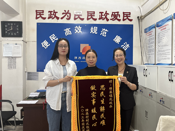 村民吳春來因出行不便,特委托橫渠村村干部王茹媚給民政社保辦送錦旗一面,以表感謝。