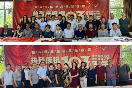 活動(dòng)開(kāi)始,街道辦曹主任講到:103年的春風(fēng)化雨,我們一路堅(jiān)定初心,103年的春華秋實(shí),我們一路守護(hù)初心,103年的千秋偉業(yè),我們一路永葆初心,在這個(gè)普天同慶的日子,我們祝黨103歲生日快樂(lè),黨是我們的驕傲,我們永遠(yuǎn)熱愛(ài)黨。一大早,藝術(shù)家們就開(kāi)始揮毫潑墨,以飽滿的熱情和精湛的技藝,創(chuàng)作出了一幅幅寓意深刻、內(nèi)涵豐富的書(shū)畫(huà)作品。這些作品不僅展現(xiàn)了書(shū)畫(huà)家們對(duì)黨的深厚感情和對(duì)祖國(guó)的無(wú)限熱愛(ài),更體現(xiàn)了中國(guó)人民在新時(shí)代新征程上繼續(xù)奮斗、勇攀高峰的堅(jiān)定信念。