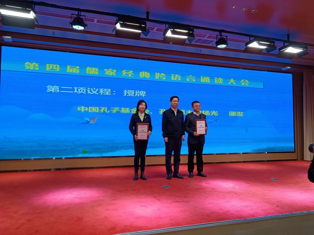 啟動(dòng)儀式上,寶雞市孔子研究會(huì)會(huì)長(zhǎng)陳寶霞為獲得孔子學(xué)堂的千陽(yáng)燕伋小學(xué)、寶雞文理學(xué)院外語(yǔ)學(xué)院、寶雞市孔子研究會(huì)、寶雞高新第三中學(xué)授牌;中國(guó)孔子基金會(huì)、孔子網(wǎng)主編楊光為獲得中華經(jīng)典國(guó)際朗誦接力活動(dòng)中表現(xiàn)突出的千陽(yáng)縣文旅局頒發(fā)了證書(shū)。