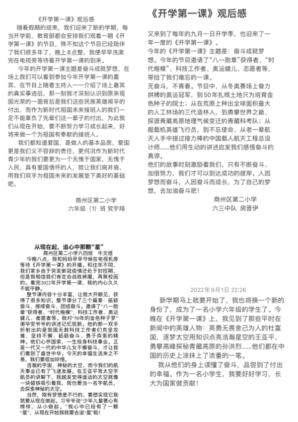 上完《開學(xué)第一課》,還有一項(xiàng)有意義的作業(yè),那就是寫觀后感。隊(duì)員們由觀而感,由淺至深,發(fā)自內(nèi)心寫出自己的收獲,為自己樹立學(xué)習(xí)的榜樣。