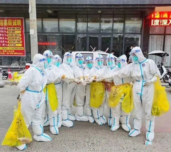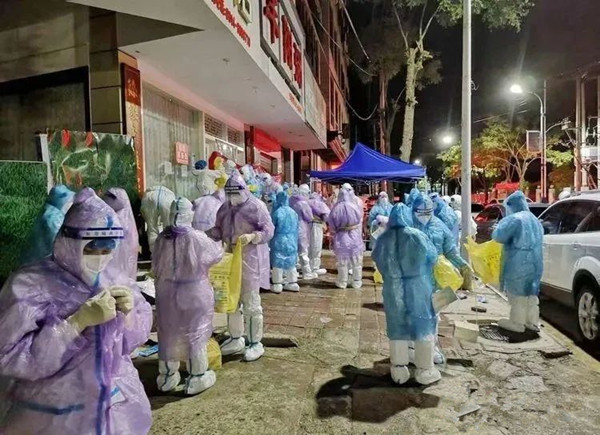 鑒于疫情形勢(shì),8月19日,他們便連夜趕到了小河子口鎮(zhèn),接連兩天都是凌晨四時(shí)緊急接受指令,披甲上陣,挺近各個(gè)村開展核酸采樣。8月22日,他們又轉(zhuǎn)戰(zhàn)至疫情最為嚴(yán)重的城關(guān)街道辦翠屏社區(qū)的高風(fēng)險(xiǎn)地區(qū),每天五點(diǎn)入戶采集所有居家隔離的700多人單人單檢核酸采樣。雖是高風(fēng)險(xiǎn)區(qū),單元門和住戶們也被貼上了封條,但他們卻沒有退縮,一次又一次前往封控小區(qū)封控樓,一步一步艱難地爬樓梯,挨家挨戶為其采樣,汗水流進(jìn)眼睛也不曾停下腳步,累了就席地而坐......面對(duì)高溫悶熱與陰雨連連,他們始終恪守專業(yè)素養(yǎng),規(guī)范操作;雖頻遇突發(fā)狀況,依然沉著冷靜應(yīng)對(duì),無(wú)人退縮;身處高危風(fēng)控,這群披荊斬棘的勇士們,不畏向險(xiǎn)而行!