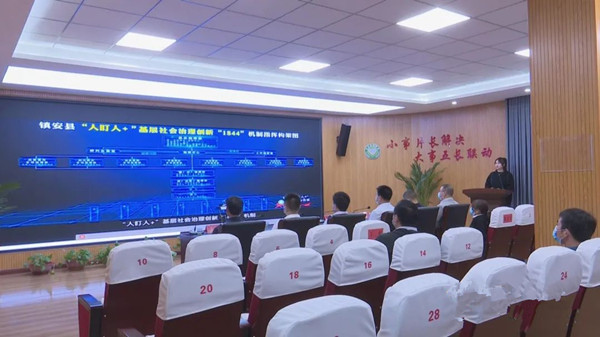 在鎮(zhèn)安縣“人盯人+”基層社會(huì)治理總指揮部,李華一行觀看了《創(chuàng)新社會(huì)治理 共享美好生活》專題片和智慧平臺(tái)功能演示,聽(tīng)取了基層社會(huì)治理工作情況匯報(bào)。