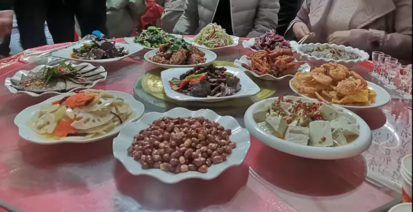 說喜事,聊家常,就像回到了自己家一樣,沒有一點(diǎn)拘束感。六點(diǎn)開席,趙川的席面和別處略有不同,每席只坐八人,先上涼菜十三花,是下酒菜,然后再上八大件硬菜熱菜,盤滿菜多豐盛的程度讓人膛目結(jié)舌。