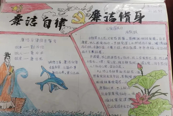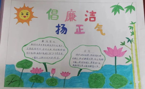 為了營(yíng)造濃厚的廉潔文化學(xué)習(xí)氛圍,學(xué)校開展了“清廉文化伴我行”藝術(shù)作品征集活動(dòng)。老師、學(xué)生紛紛用繪畫、手抄報(bào)、書法、黑板報(bào)等方式表達(dá)自己對(duì)廉潔文化的理解和崇敬。全校師生齊動(dòng)手,清廉文化傳萬家。藝術(shù)作品的征集帶動(dòng)了家庭,影響了社會(huì)。
