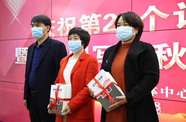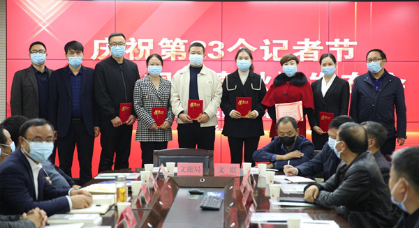 馮銳為從事新聞宣傳工作三十年榮譽(yù)證書(shū)和獎(jiǎng)?wù)芦@得者張遠(yuǎn)銀、張慶軍頒獎(jiǎng)