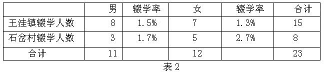 課題以定量方法為主、輔以質(zhì)性方法展開研究。實證研究數(shù)據(jù)包括王洼鎮(zhèn)農(nóng)村中小學(xué)生輟學(xué)率調(diào)查;回族男女兒童輟學(xué)率調(diào)查;當(dāng)?shù)貎和?、家長、教師走訪情況等。課題選擇寧夏回族自治區(qū)彭陽縣王洼鎮(zhèn)與石岔村,對兒童、家長、教師開展調(diào)查。綜合調(diào)查問卷法、數(shù)據(jù)統(tǒng)計法、座談和訪談法、現(xiàn)場觀察、個案追蹤。