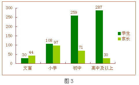 分析:該地區(qū)學(xué)生的文化程度普遍較高,在所調(diào)查的684名學(xué)生中初、高中學(xué)生占絕大多數(shù),這說明義務(wù)教育階段輟學(xué)率有所下降,但也有輟學(xué)及未入學(xué)情況發(fā)生。家長的文化程度集中于小學(xué)與初中階段,其中小學(xué)的人數(shù)居多,文盲的存在率相對較高(家長樣本容量為242),高中及其以上學(xué)歷的較少。