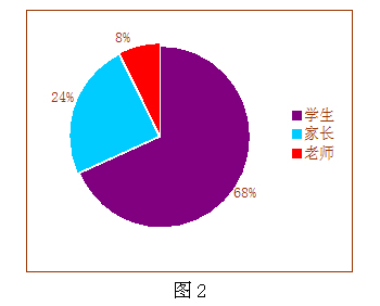 分析:可以從圖中看出在這次調(diào)查中調(diào)查對象是學(xué)生的百分比最高,本次調(diào)查主要以學(xué)生對象為主,學(xué)生占68%,即684人,其次是家長占24%,即242人,再是老師占8%,即81人。從圖表中看出,此次的調(diào)查問卷發(fā)放范圍還比較小,得到的數(shù)據(jù)的容量不夠大,且問卷結(jié)構(gòu)中老師的比例較小,使其說明性不夠明顯。在后面的調(diào)查中應(yīng)增加問卷份數(shù),加大調(diào)查對象的容量;優(yōu)化問卷結(jié)構(gòu),增加老師的數(shù)據(jù)容量,使數(shù)據(jù)更具有說服力。