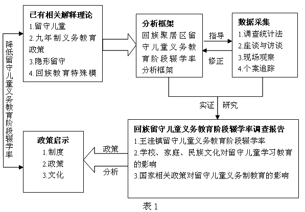 首先,基于對已有的關(guān)于留守兒童輟學(xué)情況研究進(jìn)行歸納和總結(jié),綜合我國義務(wù)制教育政策與當(dāng)?shù)鼗刈褰逃奶厥饽J浇⒉⒏倪M(jìn)回族留守兒童義務(wù)教育階段輟學(xué)率分析框架;其次,綜合利用調(diào)查統(tǒng)計法、座談和訪談法、現(xiàn)場觀察、個案追蹤等研究方法對當(dāng)?shù)剌z學(xué)回族留守兒童進(jìn)行現(xiàn)狀分析;最后,結(jié)合相關(guān)理論和具體情境提出研究假設(shè),探討義務(wù)教育階段回族留守兒童輟學(xué)率的影響因素以提供政策啟示與建議。