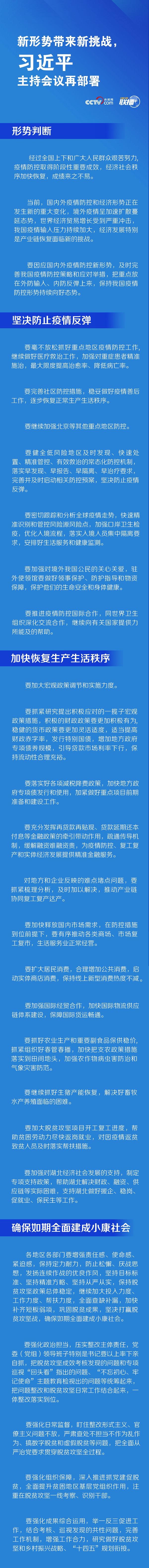 面對新形勢和新挑戰(zhàn),本次會議圍繞疫情防控、恢復(fù)生產(chǎn)生活秩序、確保如期全面建成小康社會三大重點任務(wù)進行了具體部署?!堵?lián)播+》特進行梳理,與您一同學習。