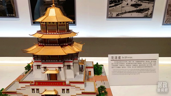 △這是林芝市城市規(guī)劃館展示的尼洋閣模型,實際建筑高36.9米,由福建省三批援藏工作隊接力完成建設(shè),現(xiàn)為藏東南文化遺產(chǎn)博物館。(總臺央視記者李曉周拍攝)