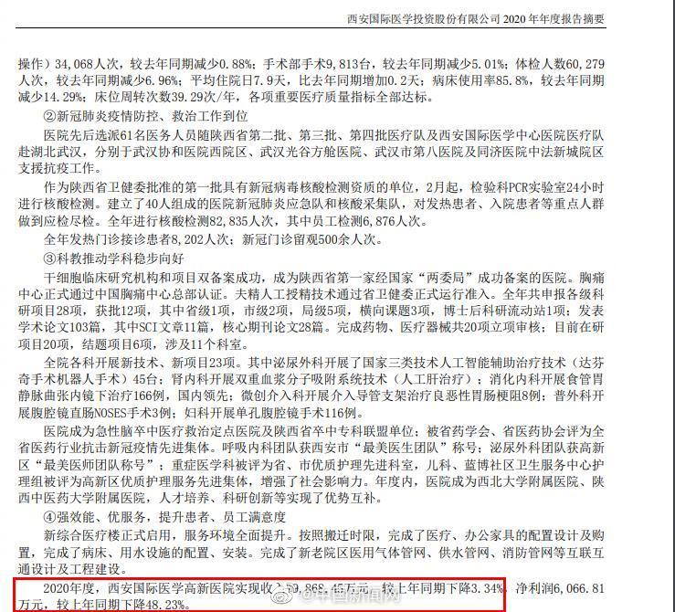 1月6日,西安孕婦流產事件相關責任人被處理,西安高新醫(yī)院總經理范郁會被停職。根據(jù)西安衛(wèi)健委官網(wǎng),西安高新醫(yī)院2011年經營性質由非營利性變更為營利性。據(jù)天眼查顯示,西安高新醫(yī)院有限公司是A股上市公司“國際醫(yī)學”的全資子公司。國際醫(yī)學的財報顯示,西安高新醫(yī)院是重要的營收及利潤來源。2020年度,西安高新醫(yī)院收入7.99億元,實現(xiàn)凈利潤6066.81萬元。截至發(fā)稿,國際醫(yī)學股價大跌,跌幅一度超8%。