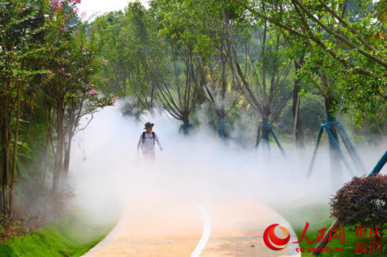 兩江新區(qū)禮嘉智慧體驗(yàn)園,裝有紅外線和溫度感應(yīng)的智慧涼道,在高溫天氣為行人提供涼爽的步行環(huán)境。鄒樂攝