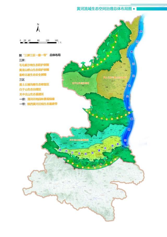 “三屏三區(qū)一廊一帶”,即毛烏素沙地生態(tài)防護屏障、黃龍山橋山生態(tài)保護屏障、秦嶺北坡生態(tài)安全屏障,黃土丘陵溝壑生態(tài)修復(fù)區(qū)、白于山生態(tài)治理區(qū)、關(guān)中北山生態(tài)重建區(qū),渭河谷地園林景觀綠廊和陜西黃河沿線生態(tài)重建帶。