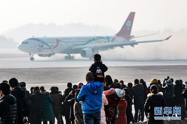 參加試飛的四川航空股份有限公司“成都大運號”主題涂裝A330客機降落在成都天府國際機場(1月22日攝)。新華社記者 沈伯韓 攝