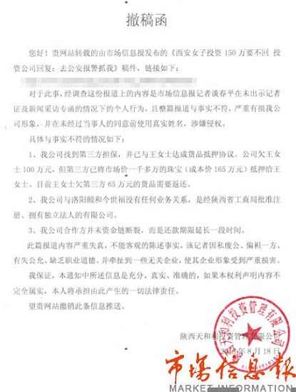 8月16日本報報道了西安一國企上班的王女士投資了150萬要不回,擔憂眾多投資者血本無歸,陜西天和利投資管理有限公司回復:可以去公安報警抓我一文后,然而眾多轉(zhuǎn)載網(wǎng)站卻收到了陜西天和利投資管理有限公司的撤稿函,撤稿函中指出報道不實,是記者的個人行為,電話中一直要求見面,向本報記者闡述他的事實。