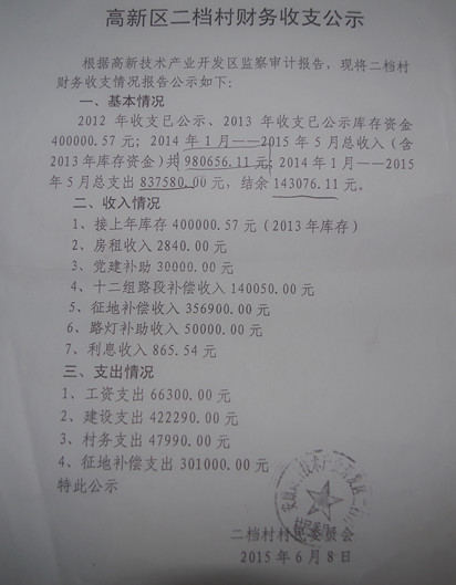 (上圖為陜西安康高新二檔村財(cái)務(wù)收支2015年6月8公示)