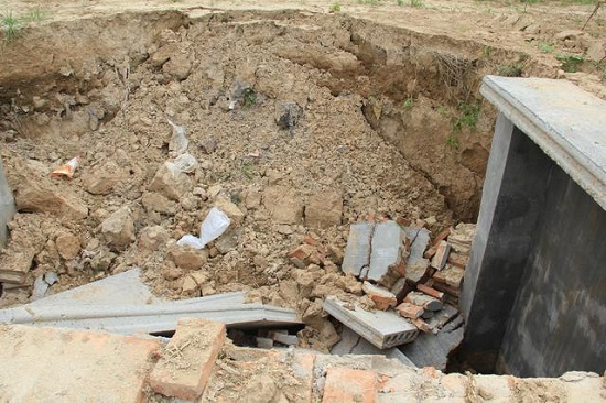 華縣高塘鎮(zhèn)塬區(qū)某村民介紹說,上邊中央的政策非常好,處處替農(nóng)民著想,但到了基層,中央的項(xiàng)目怕成了個(gè)別人發(fā)財(cái)撈錢的機(jī)會(huì)。群眾不申報(bào)吧,眼望著好政策與己無關(guān)不甘心;申報(bào)吧,施工驗(yàn)收均走了樣,工程半拉子多、失敗的多,見效的少。這不,這個(gè)“水窖”剛建起來沒幾天就塌方成這樣了,幸虧當(dāng)時(shí)樓板上沒有站人或堆放雜物,否則全掉進(jìn)深坑了,若遇上小孩,豈不丟了性命!