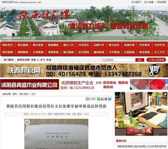 近日,有網(wǎng)友孫云云實(shí)名向媒體舉報(bào),黃陵縣農(nóng)村信用合作聯(lián)社隆坊信用社主任張維軍,在任職雙龍鎮(zhèn)信用社主任期間違規(guī)從自己所在的信用聯(lián)社貸款40萬(wàn)元,用于轉(zhuǎn)貸款給他人。