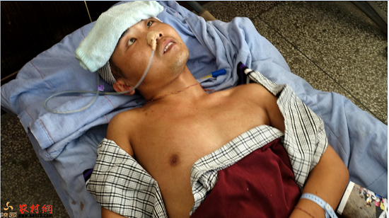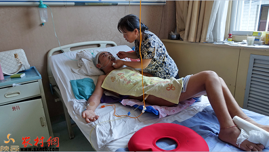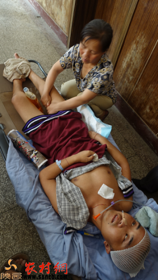 25歲的精壯小伙劉強是扶風(fēng)縣召公鎮(zhèn)吳家村人,在周至縣終南鎮(zhèn)境內(nèi)一水泥制品廠打工從8.5米高空墜落,幾經(jīng)輾轉(zhuǎn),現(xiàn)在在周至縣中醫(yī)院治療。8月9日,記者在周至縣中醫(yī)院住院部病房見到的劉強頭部浮腫、目光呆滯、靠管路輸入流食維持生命。一旁的劉強父親劉建文,頭發(fā)花白、面目黝黑、愁容滿面,與記者第一次見到時判若兩人。一旁的劉強母親見到記者問起劉強事情的進展情況,不時用手抹眼淚。歷經(jīng)三個多月,圍繞劉強在周至打工受傷以及治療等的進展,劉建文說簡直就像做惡夢一般”!而他們?yōu)榇烁冻龅木?、心血、財力,幾乎讓他心力交?-----