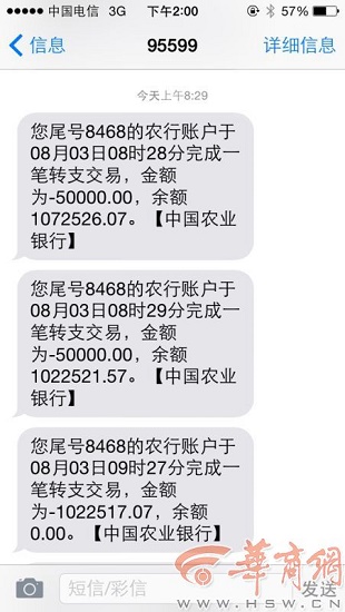 華商記者注意到,王先生的手機(jī)短信記錄顯示,第一次轉(zhuǎn)支交易發(fā)生在8月3日8時(shí)28分,轉(zhuǎn)支五萬(wàn)元,一分鐘后又轉(zhuǎn)支五萬(wàn)元。王先生說(shuō),情急之下,他趕忙向朋友求救,朋友說(shuō)盡快撥打銀行電話掛失?!拔亿s緊登錄網(wǎng)銀,故意輸錯(cuò)五次密碼,賬戶自動(dòng)鎖定?!彪S后,王先生以最快的速度趕到開(kāi)戶行中國(guó)農(nóng)業(yè)銀行榆林文化路支行,重新開(kāi)卡后,將剩余的100多萬(wàn)元都存入這張卡上。