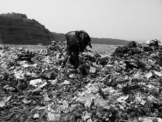 撿拾工人在垃圾堆里挑揀難以分解的塑料制品