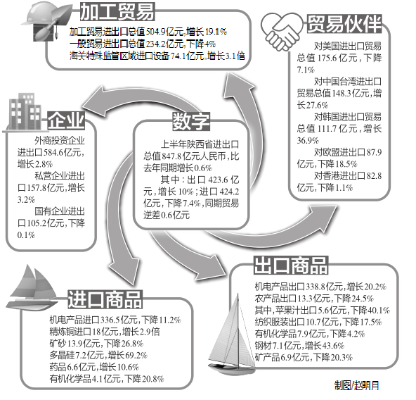 昨日,來自西安海關(guān)統(tǒng)計(jì)數(shù)據(jù)顯示,2015年上半年陜西省進(jìn)出口總值847.8億元人民幣,比去年同期增長0.6%,年內(nèi)外貿(mào)總值同比首次轉(zhuǎn)為增長。加工貿(mào)易進(jìn)出口占比近6成,外資、私營企業(yè)進(jìn)出口增長,國有企業(yè)進(jìn)出口微降,美國、中國臺灣、韓國為前三大貿(mào)易伙伴。