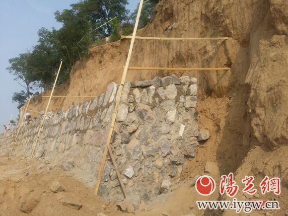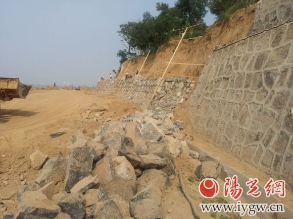 7月16日,富平縣城南大橋東側(cè)的王旦村河畔,護(hù)坡工程返工現(xiàn)場(chǎng),數(shù)十工人在烈日下?lián)]汗如雨兩輛挖機(jī)在土石混雜的丘包中撿拾石料。這些大量被掩埋的石頭應(yīng)是垮塌后撿拾準(zhǔn)備再次被砌上坡面。U型護(hù)坡3面長(zhǎng)度差不多三四百米,如今僅殘存百八十米。
