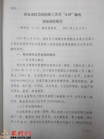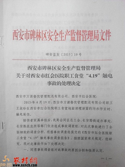 此事發(fā)生之后,相關(guān)職能部門立即聯(lián)合成立了“碑林區(qū)‘4.19’事故調(diào)查組”,經(jīng)過深入細(xì)致的調(diào)查之后,及時(shí)出具了“西安市紅會(huì)醫(yī)院職工食堂‘4.19’觸電事故調(diào)查報(bào)告;西安市碑林區(qū)安全生產(chǎn)監(jiān)督管理局也及時(shí)做出了“關(guān)于對西安市紅會(huì)醫(yī)院職工食堂‘4.19’觸電事故的處理決定”。