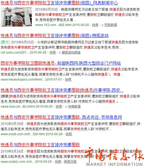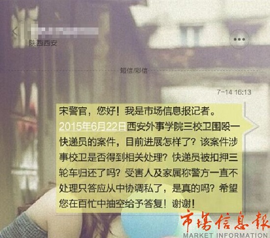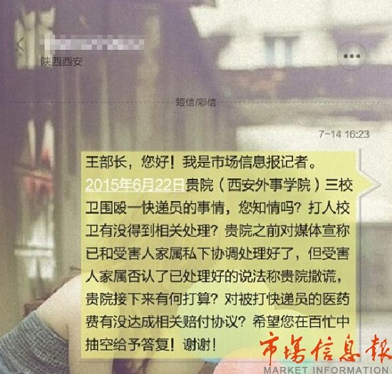 6月25日,西安外事學(xué)院三校衛(wèi)圍毆快遞員一事,霸占了陜西各媒體及新聞?dòng)浾叩奈⒉╊^條,接著該學(xué)院稱“怕影響招生”給各媒體發(fā)函要求刪除新聞的舉動(dòng)又引起軒然大波。7月14日,被打快遞員小宋以“事情發(fā)生近一個(gè)月,派出所不作為,打人校衛(wèi)扣車不還并逍遙法外,賠償無人問津”等質(zhì)疑,誰在為西安外事學(xué)院打人校衛(wèi)“遮風(fēng)擋雨”?本報(bào)記者走訪獲悉,受害人小宋醫(yī)療費(fèi)用無人賠付,其被西安外事學(xué)院校衛(wèi)非法扣押的三輪車不知去向,打人校衛(wèi)至今在崗。