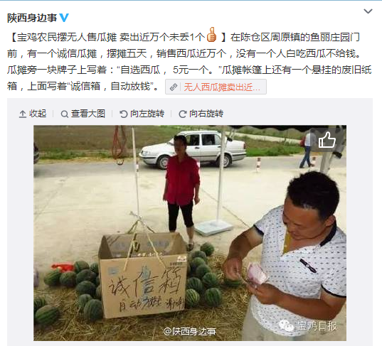 編者按:誠信瓜攤,擺攤5天,銷售西瓜近萬個,沒有一個人白拿。小販相信顧客的誠實,顧客信任小販的商品。社會需要的不就是這樣的互相信任么?