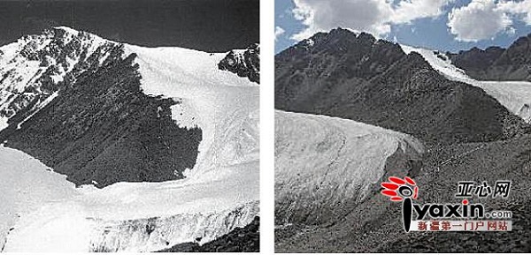 這張拼版照片顯示的是1983年拍攝的天山一號冰川一角(左圖)和2012年拍攝的天山一號冰川分離為東支與西支兩條獨立的冰川(右圖)。據(jù)中科院天山冰川觀測試驗站觀測數(shù)據(jù)顯示,隨著氣溫逐年升高,新疆天山一號冰川持續(xù)加速消融和退縮。新華社發(fā)