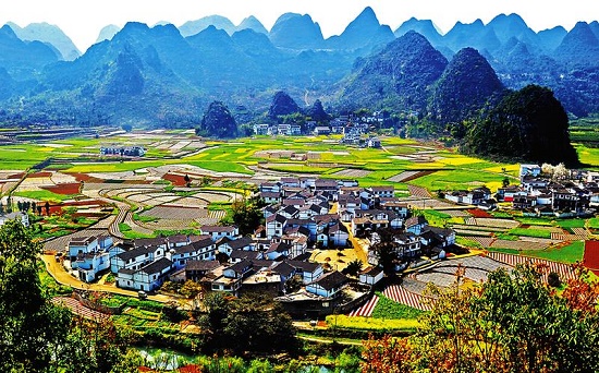 下納灰村是一個被萬峰林環(huán)抱的布依族村寨。萬峰林是典型的錐狀喀斯特地質(zhì)景觀,兩萬多座山峰摩肩接踵,蔚然成林。