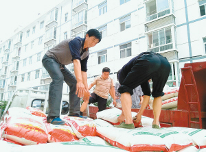 岳壩鎮(zhèn)栗子壩村的干部為受災(zāi)群眾搬運糧食