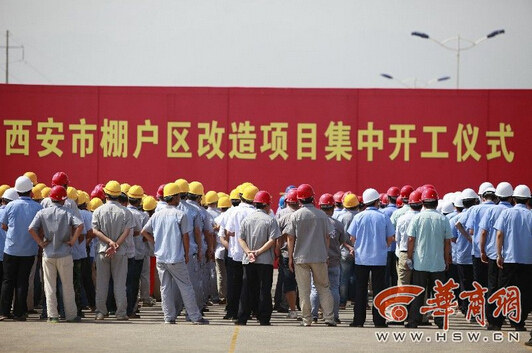 ?隨著指揮旗號令,現(xiàn)場挖掘機鳴笛,7月1日上午10時20分,在西安市長安區(qū)杜永村,這標(biāo)志著火車站北廣場等全市10個棚戶區(qū)改造項目正式集中開工。